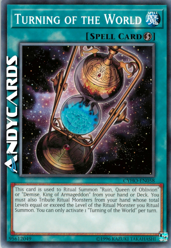 This card is used to Ritual Summon "Ruin, Queen of Oblivion" or "Demise, King of Armageddon" from your hand or Deck. You must also Tribute Ritual Monsters from your hand whose total Levels equal or exceed the Level of the Ritual Monster you Ritual Summon. You can only activate 1 "Turning of the World" per turn.