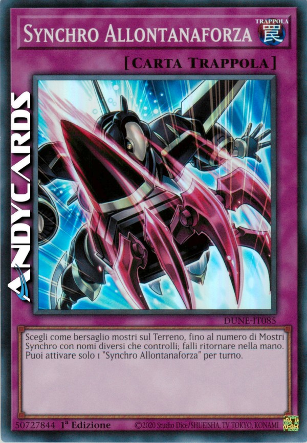 Scegli come bersaglio mostri sul Terreno, fino al numero di Mostri Synchro con nomi diversi che controlli; falli ritornare nella mano. Puoi attivare solo 1 "Synchro Allontanaforza" per turno.
