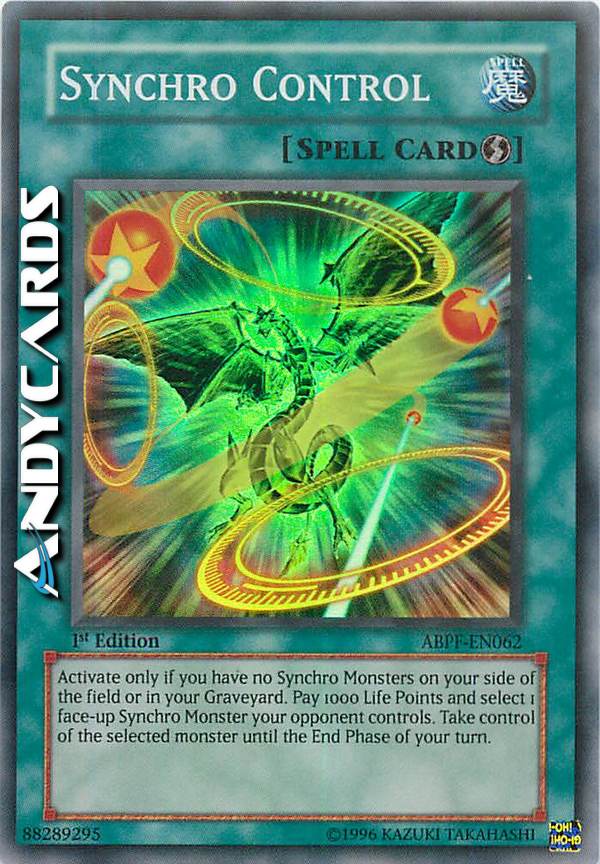 Activate only if you have no Synchro Monsters on your side of the field or in your Graveyard. Pay 1000 Life Points and select 1 face-up Synchro Monster your opponent controls. Take control of the selected monster until the End Phase of your turn.