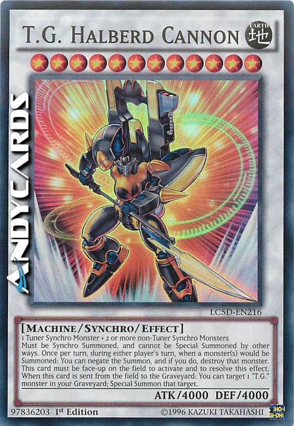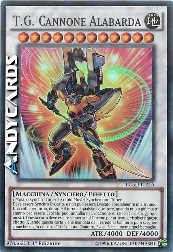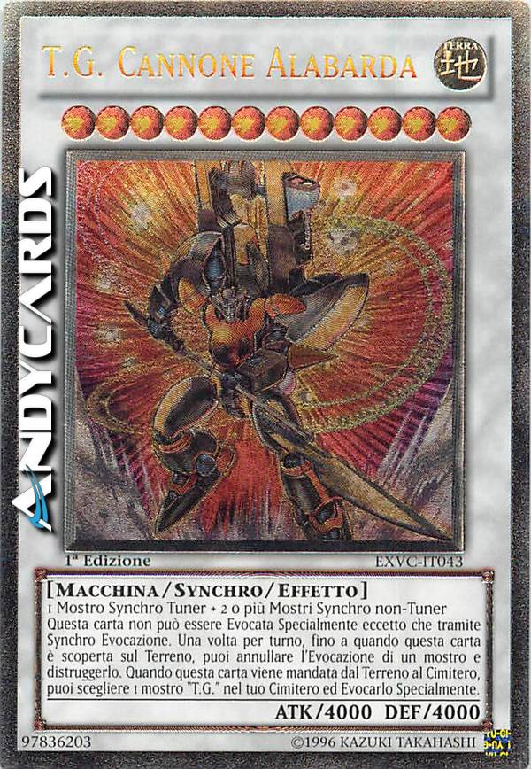 1 Mostro Synchro Tuner + 2 o più Mostri Synchro non-Tuner Questa carta non può essere Evocata Specialmente eccetto che tramite Synchro Evocazione. Una volta per turno, fino a quando questa carta è scoperta sul Terreno, puoi annullare l'Evocazione di un mostro e distruggerlo. Quando questa carta viene mandata dal Terreno al Cimitero, puoi scegliere 1 mostro "T.G." nel tuo Cimitero ed Evocarlo Specialmente.