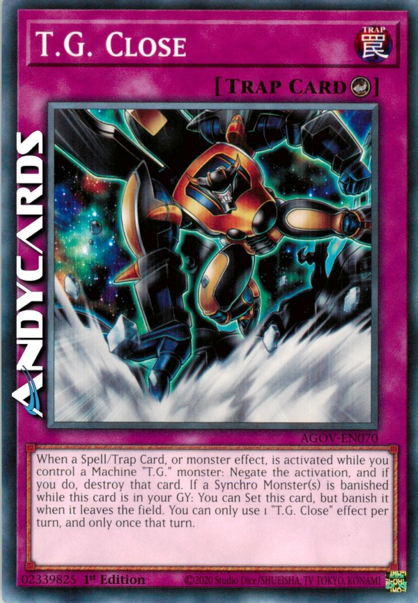 When a Spell/Trap Card, or monster effect, is activated while you control a Machine "T.G." monster: Negate the activation, and if you do, destroy that card. If a Synchro Monster(s) is banished while this card is in your GY: You can Set this card, but banish it when it leaves the field. You can only use 1 "T.G. Close" effect per turn, and only once that turn.