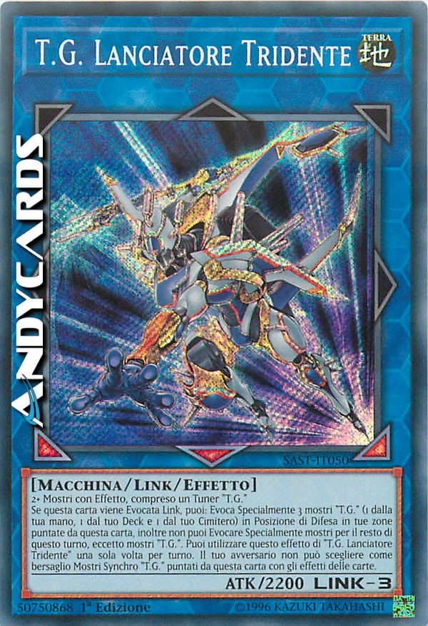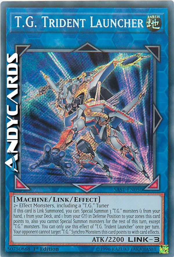 Se questa carta viene Evocata Link, puoi: Evoca Specialmente 3 mostri "T.G." (1 dalla tua mano, 1 dal tuo Deck e 1 dal tuo Cimitero) in Posizione di Difesa in tue zone puntate da questa carta, inoltre non puoi Evocare Specialmente mostri per il resto di questo turno, eccetto mostri "T.G.". Puoi utilizzare questo effetto di "T.G. Lanciatore Tridente" una sola volta per turno. Il tuo avversario non può scegliere come bersaglio Mostri Synchro "T.G." puntati da questa carta con gli effetti delle carte.
