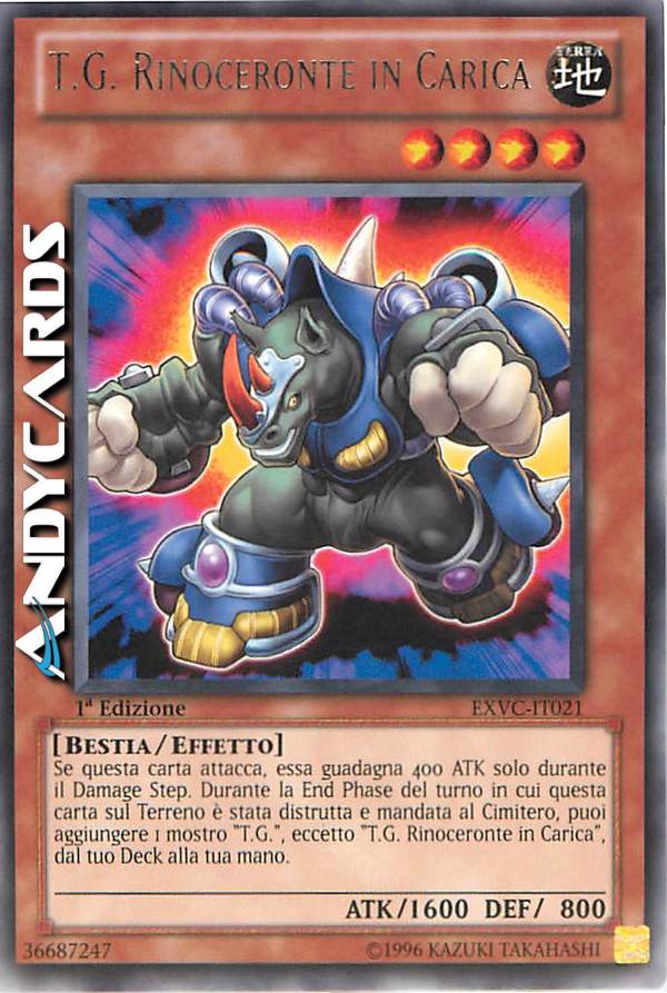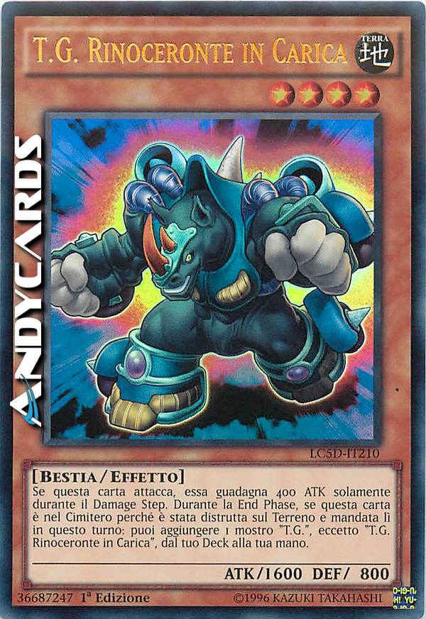 Se questa carta attacca, essa guadagna 400 ATK solo durante il Damage Step. Durante la End Phase del turno in cui questa carta sul Terreno è stata distrutta e mandata al Cimitero, puoi aggiungere 1 mostro "T.G.", eccetto "T.G. Rinoceronte in Carica", dal tuo Deck alla tua mano.