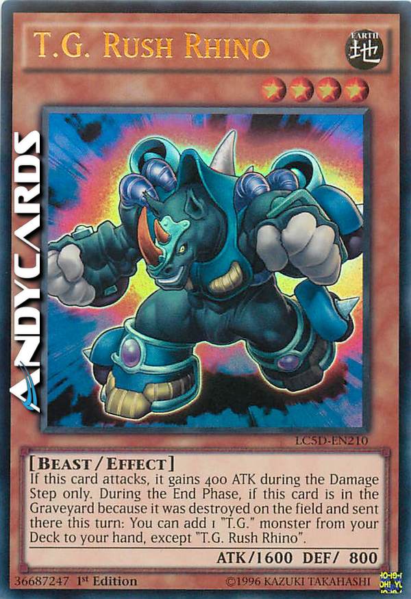 If this card attacks, it gains 400 ATK during the Damage Step only. During the End Phase of the turn this card on the field was destroyed and sent to the Graveyard, you can add 1 "T.G." monster from your Deck to your hand, except "T.G. Rush Rhino".