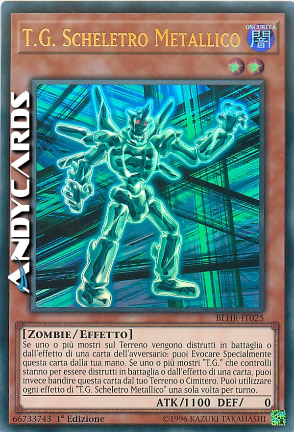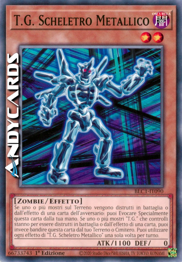 Se uno o più mostri sul Terreno vengono distrutti in battaglia o dall'effetto di una carta dell'avversario: puoi Evocare Specialmente questa carta dalla tua mano. Se uno o più mostri "T.G." che controlli stanno per essere distrutti in battaglia o dall'effetto di una carta, puoi invece bandire questa carta dal tuo Terreno o Cimitero. Puoi utilizzare ogni effetto di "T.G. Scheletro Metallico" una sola volta per turno.