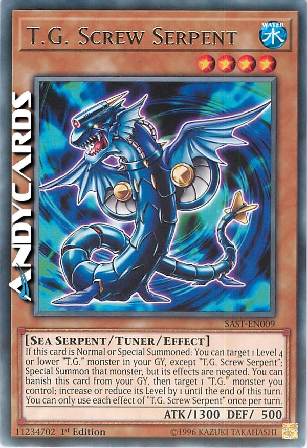 If this card is Normal or Special Summoned: You can target 1 Level 4 or lower "T.G." monster in your GY, except "T.G. Screw Serpent"; Special Summon that monster, but its effects are negated. You can banish this card from your GY, then target 1 "T.G." monster you control; increase or reduce its Level by 1 until the end of this turn. You can only use each effect of "T.G. Screw Serpent" once per turn.