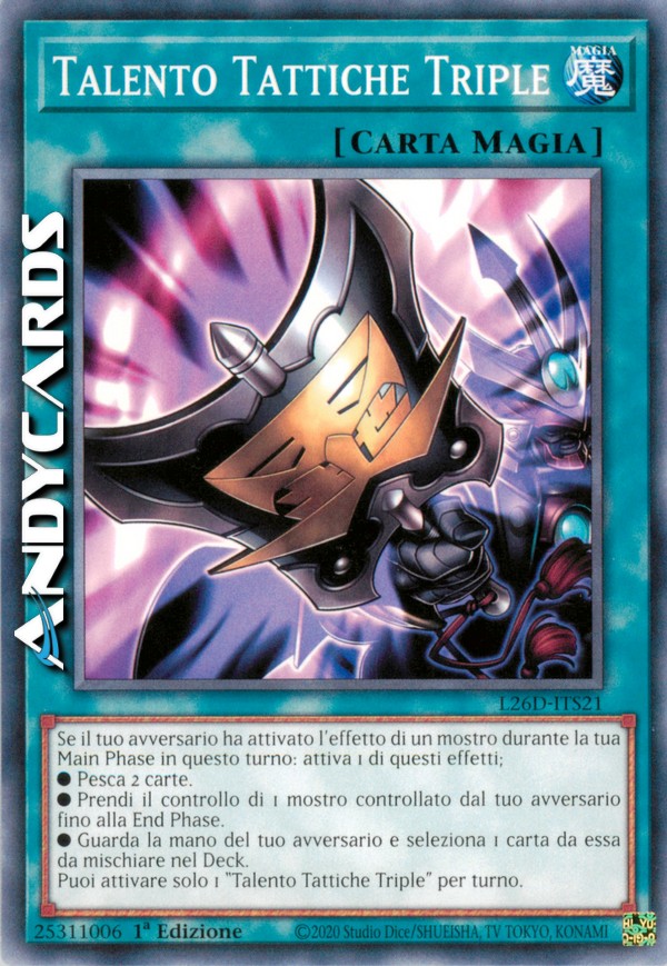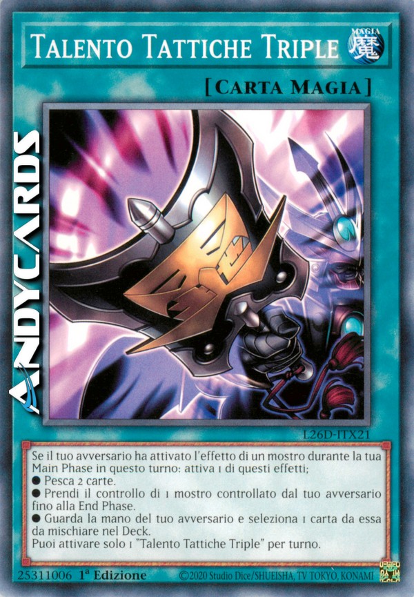 Se il tuo avversario ha attivato l'effetto di un mostro durante la tua Main Phase in questo turno: attiva 1 di questi effetti; ●Pesca 2 carte. ●Prendi il controllo di 1 mostro controllato dal tuo avversario fino alla End Phase. ●Guarda la mano del tuo avversario e seleziona 1 carta da essa da mischiare nel Deck. Puoi attivare solo 1 "Talento Tattiche Triple" per turno.