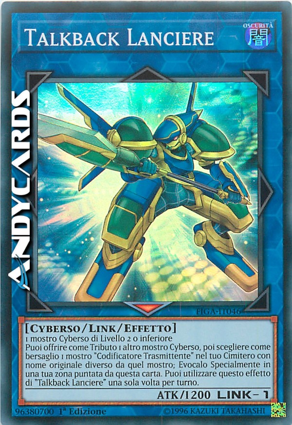 Puoi offrire come Tributo 1 altro mostro Cyberso, poi scegliere come bersaglio 1 mostro "Codificatore Trasmittente" nel tuo Cimitero con nome originale diverso da quel mostro; Evocalo Specialmente in una tua zona puntata da questa carta. Puoi utilizzare questo effetto di "Talkback Lanciere" una sola volta per turno.