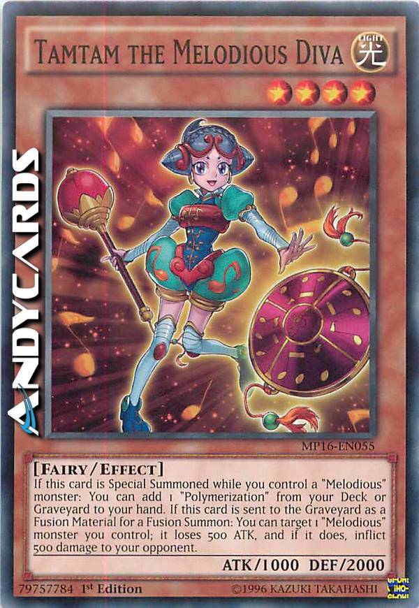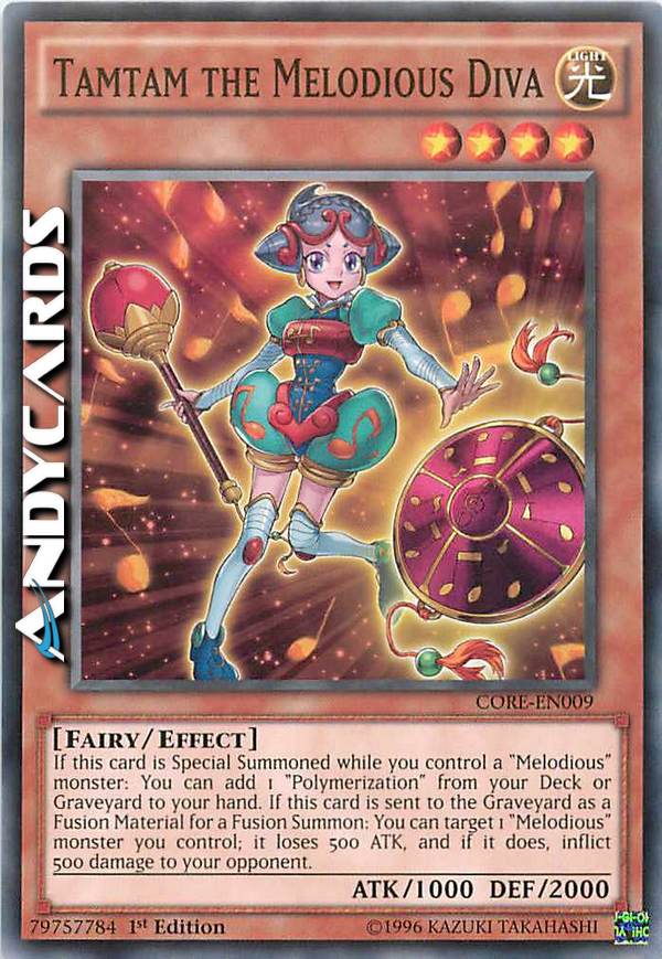 Se questa carta viene Evocata Specialmente mentre controlli un mostro "Melodiosa": puoi aggiungere 1 "Polimerizzazione" dal tuo Deck o Cimitero alla tua mano. Se questa carta viene mandata al Cimitero come Materiale da Fusione per un'Evocazione tramite Fusione: puoi scegliere come bersaglio 1 mostro "Melodiosa" che controlli; esso perde 500 ATK e, se lo fa, infliggi 500 danni al tuo avversario.