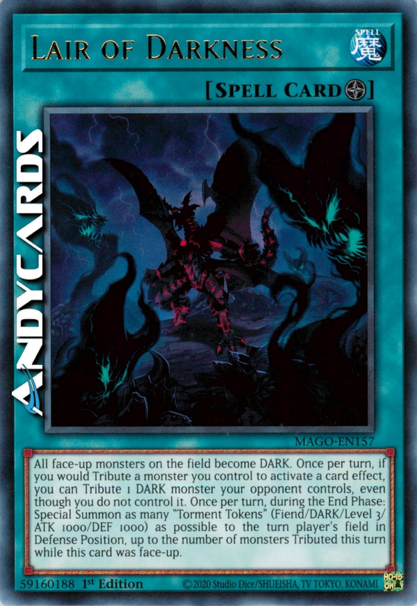 All face-up monsters on the field become DARK. Once per turn, if you would Tribute a monster you control to activate a card effect, you can Tribute 1 DARK monster your opponent controls, even though you do not control it. Once per turn, during the End Phase: Special Summon as many "Torment Tokens" (Fiend/DARK/Level 3/ATK 1000/DEF 1000) as possible to the turn player's field in Defense Position, up to the number of monsters Tributed this turn while this card was face-up.