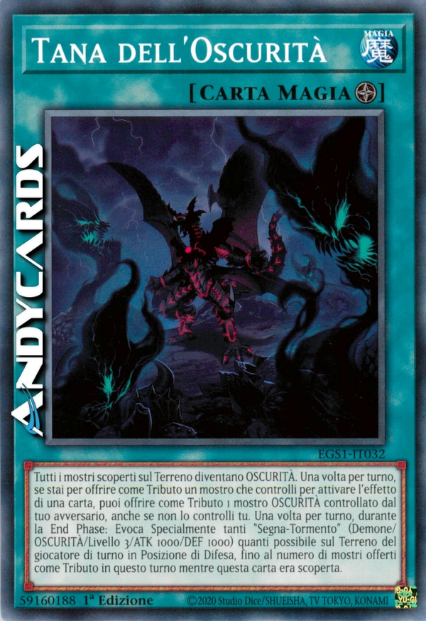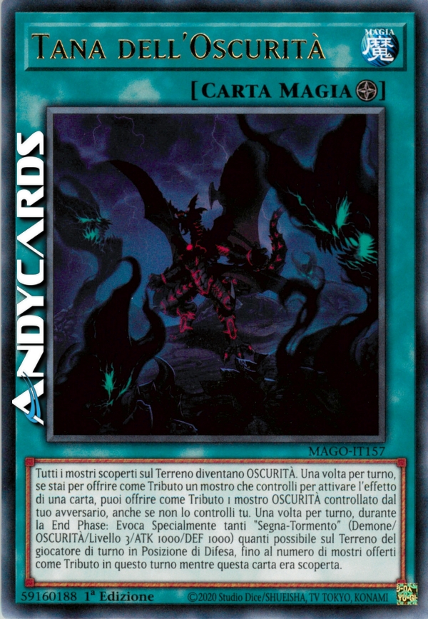 Tutti i mostri scoperti sul Terreno diventano OSCURITÀ. Una volta per turno, se stai per offrire come Tributo un mostro che controlli per attivare l'effetto di una carta, puoi offrire come Tributo 1 mostro OSCURITÀ controllato dal tuo avversario, anche se non lo controlli tu. Una volta per turno, durante la End Phase: Evoca Specialmente tanti "Segna-Tormento" (Demone/OSCURITÀ/Livello 3/ATK 1000/DEF 1000) quanti possibile sul Terreno del giocatore di turno in Posizione di Difesa, fino al numero di mostri offerti come Tributo in questo turno mentre questa carta era scoperta.