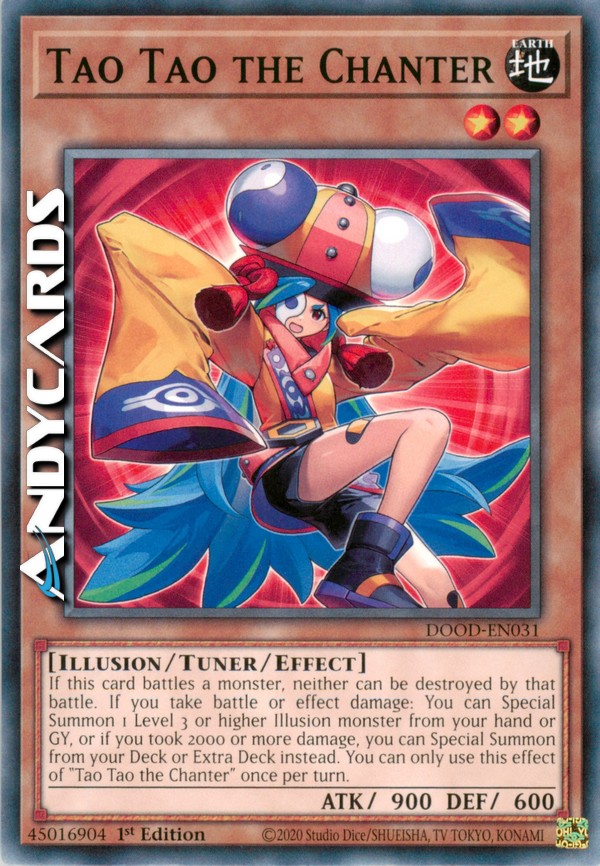 Se questa carta combatte con un mostro, nessuno dei due può essere distrutto in quella battaglia. Se subisci danno da combattimento o da effetto: puoi Evocare Specialmente 1 mostro Illusione di Livello 3 o superiore dalla tua mano o Cimitero o, se hai subito 2000 o più danni, puoi invece Evocarlo Specialmente dal tuo Deck o Extra Deck. Puoi utilizzare questo effetto di "Tao Tao il Cantore" una sola volta per turno.