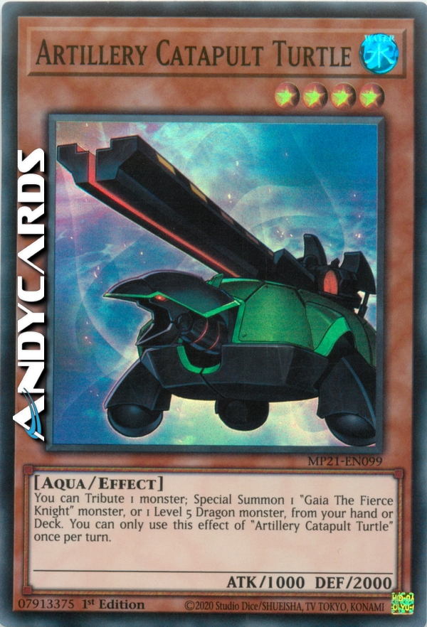 You can Tribute 1 monster; Special Summon 1 "Gaia The Fierce Knight" monster, or 1 Level 5 Dragon monster, from your hand or Deck. You can only use this effect of "Artillery Catapult Turtle" once per turn.