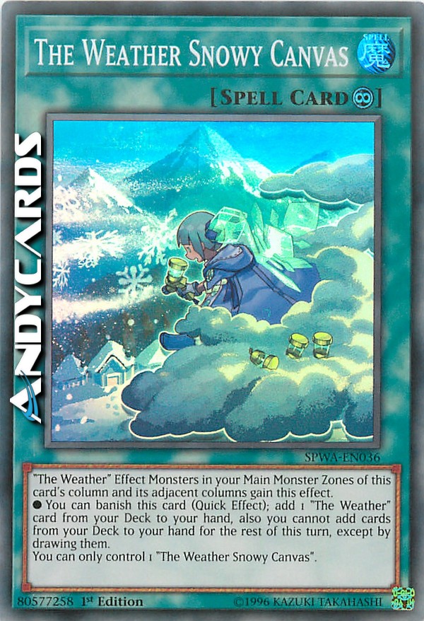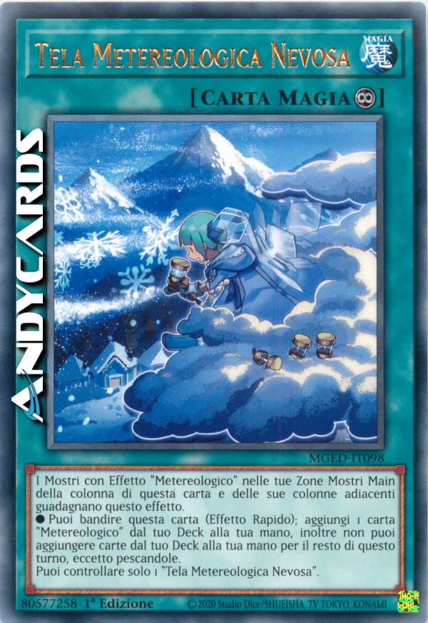 I Mostri con Effetto "Metereologico" nelle tue Zone Mostri Main della colonna di questa carta e delle sue colonne adiacenti guadagnano questo effetto. - Puoi bandire questa carta (Effetto Rapido); aggiungi 1 carta "Metereologico" dal tuo Deck alla tua mano, inoltre non puoi aggiungere carte dal tuo Deck alla tua mano per il resto di questo turno, eccetto pescandole. - Puoi controllare solo 1 "Tela Metereologica Nevosa".