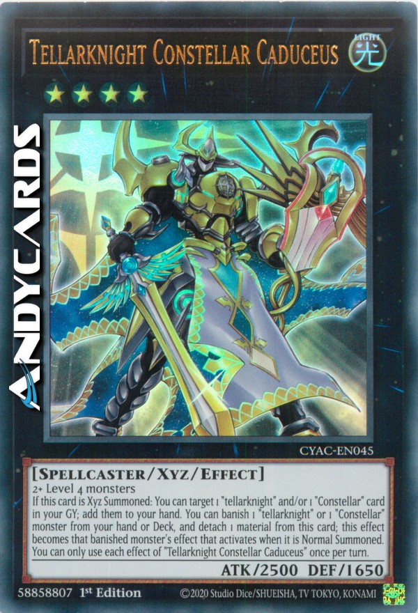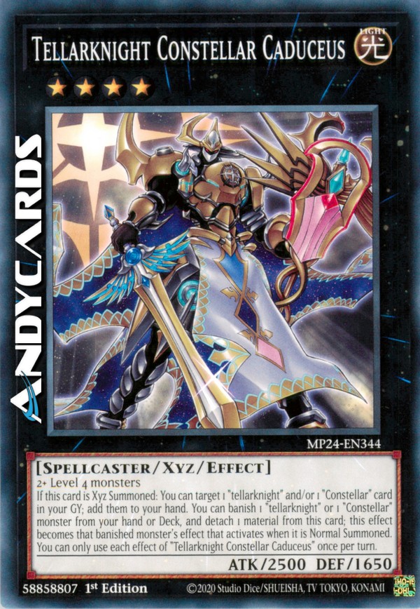 Se questa carta viene Evocata Xyz: puoi scegliere come bersaglio 1 carta "tellcavaliere" e/o 1 carta "Costellazione" nel tuo Cimitero; aggiungile alla tua mano. Puoi bandire 1 mostro "tellcavaliere" o 1 mostro "Costellazione" dalla tua mano o Deck, e staccare 1 materiale da questa carta; questo effetto diventa l'effetto di quel mostro bandito che si attiva quando viene Evocato Normalmente. Puoi utilizzare ogni effetto di "Tellcavaliere Costellazione Caduceo" una sola volta per turno.