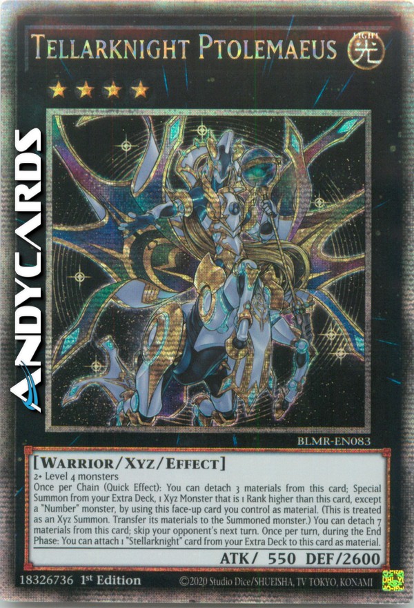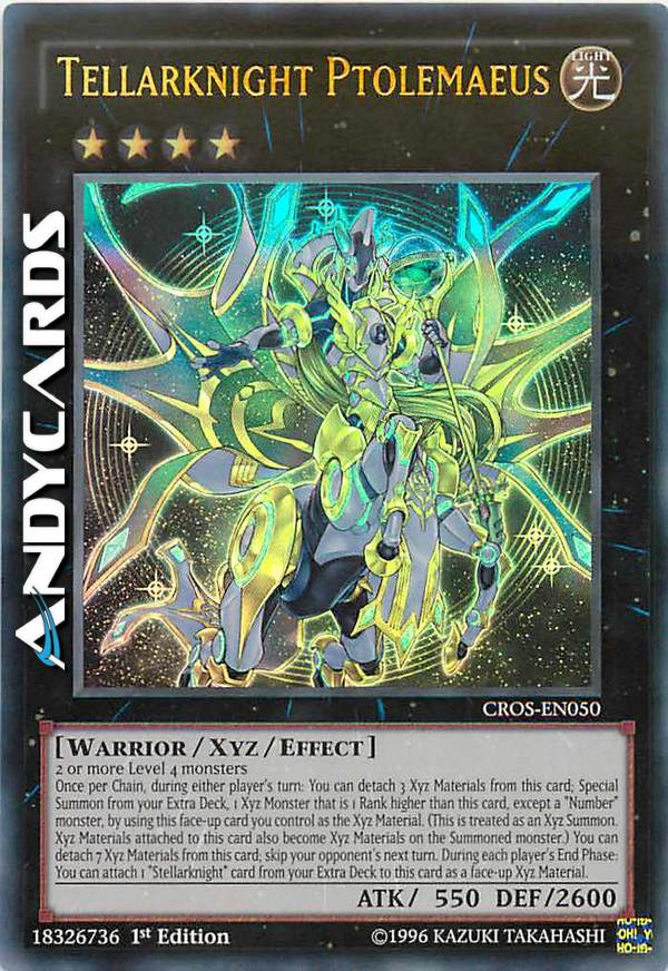 2 or more Level 4 monsters Once per Chain, during either player's turn: You can detach 3 Xyz Materials from this card; Special Summon from your Extra Deck, 1 Xyz monster that is 1 Rank higher than this card, except a "Number" monster, by using this face-up card you control as the Xyz Material. (This is treated as an Xyz Summon. Xyz Materials attached to this card also become Xyz Materials on the Summoned monster.) You can detach 7 Xyz Materials from this card; skip your opponent's next turn. During each player's End Phase: You can attach 1 "Stellarknight" card from your Extra Deck to this card as a face-up Xyz Material.