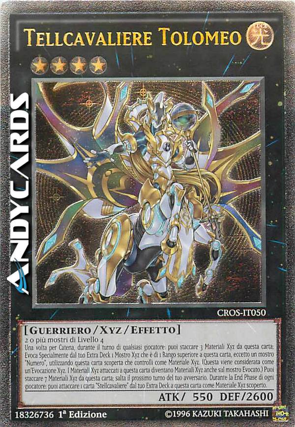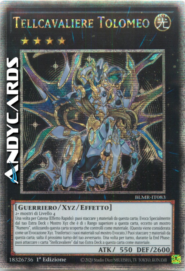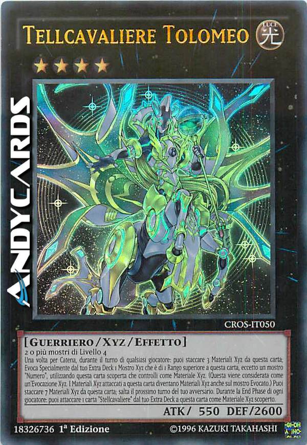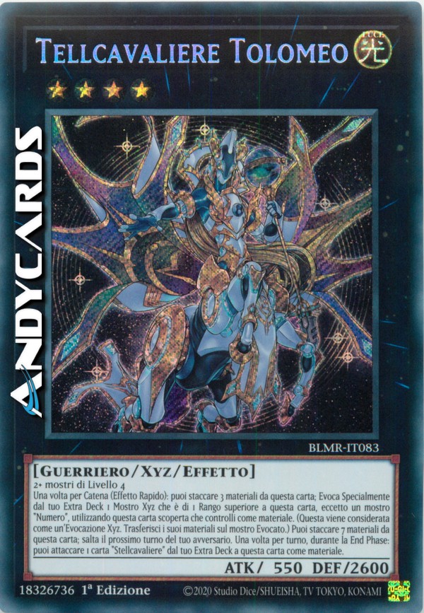 Una volta per Catena (Effetto Rapido): puoi staccare 3 materiali da questa carta; Evoca Specialmente dal tuo Extra Deck 1 Mostro Xyz che è di 1 Rango superiore a questa carta, eccetto un mostro "Numero", utilizzando questa carta scoperta che controlli come materiale. (Questa viene considerata come un'Evocazione Xyz. Trasferisci i suoi materiali sul mostro Evocato.) Puoi staccare 7 materiali da questa carta; salta il prossimo turno del tuo avversario. Una volta per turno, durante la End Phase: puoi attaccare 1 carta "Stellcavaliere" dal tuo Extra Deck a questa carta come materiale.