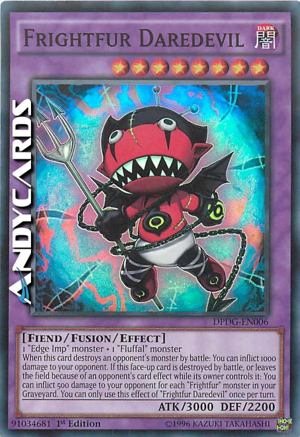 1 "Edge Imp" monster + 1 "Fluffal" monster - When this card destroys an opponent's monster by battle: You can inflict 1000 damage to your opponent. If this face-up card is destroyed by battle, or leaves the field because of an opponent's card effect while its owner controls it: You can inflict 500 damage to your opponent for each "Frightfur" monster in your Graveyard. You can only use this effect of "Frightfur Daredevil" once per turn.