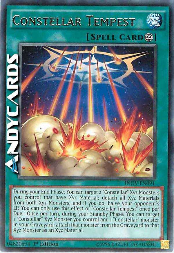 During your End Phase: You can target 2 "Constellar" Xyz Monsters you control that have Xyz Material; detach all Xyz Materials from both Xyz Monsters, and if you do, halve your opponent's LP. You can only use this effect of "Constellar Tempest" once per Duel. Once per turn, during your Standby Phase: You can target 1 "Constellar" Xyz Monster you control and 1 "Constellar" monster in your Graveyard; attach that monster from the Graveyard to that Xyz Monster as an Xyz Material.