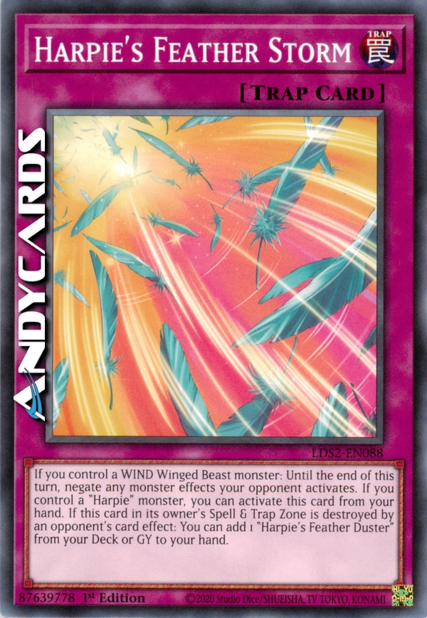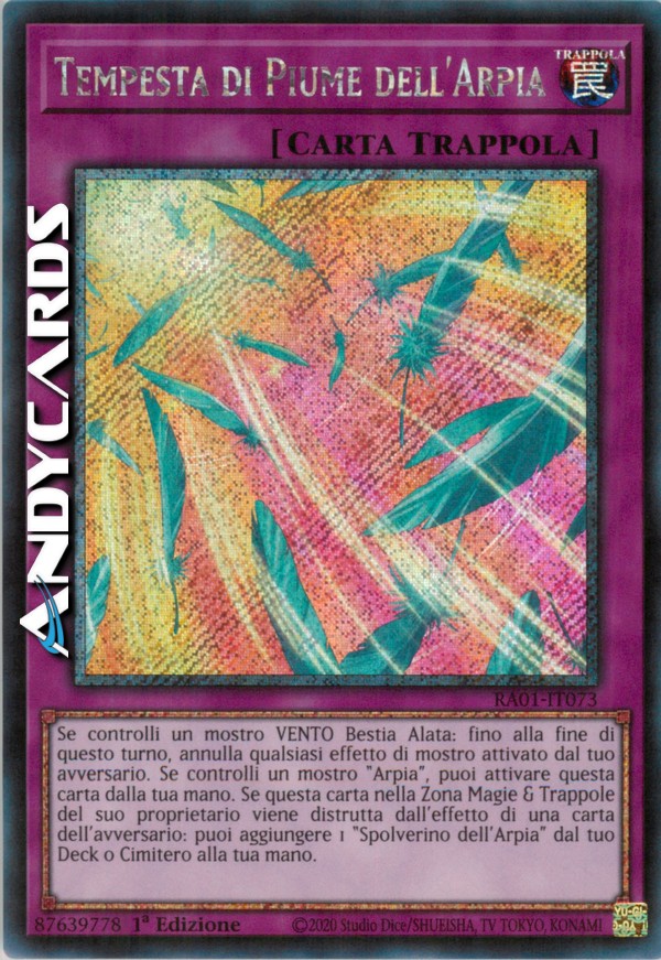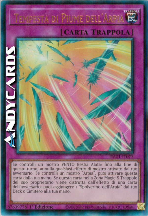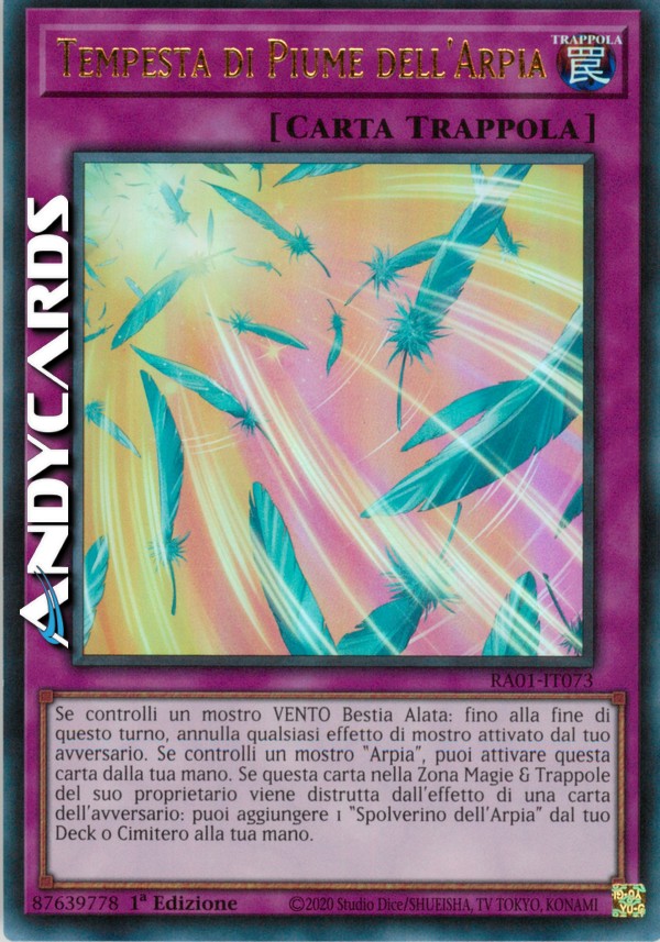 Se controlli un mostro VENTO Bestia Alata: fino alla fine di questo turno, annulla qualsiasi effetto di mostro attivato dal tuo avversario. Se controlli un mostro "Arpia", puoi attivare questa carta dalla tua mano. Se questa carta nella Zona Magie & Trappole del suo proprietario viene distrutta dall'effetto di una carta dell'avversario: puoi aggiungere 1 "Spolverino dell'Arpia" dal tuo Deck o Cimitero alla tua mano.