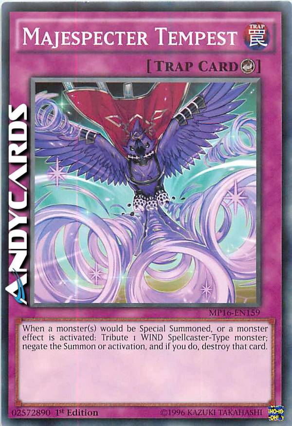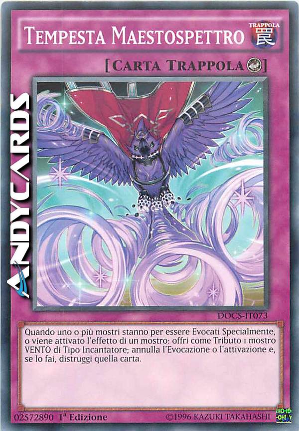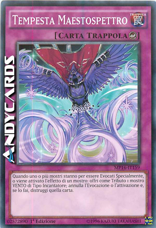 Quando uno o più mostri stanno per essere Evocati Specialmente, o viene attivato l'effetto di un mostro: offri come Tributo 1 mostro VENTO Incantatore; annulla l'Evocazione o l'attivazione e, se lo fai, distruggi quella carta.