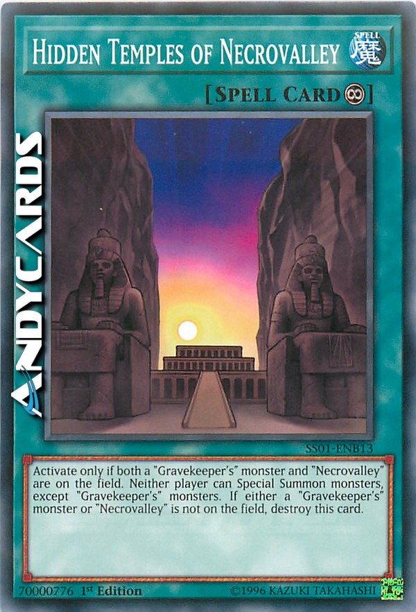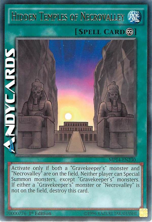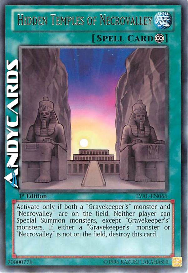 Attiva solo se sia un mostro "Custode di Tombe" che "Necrovalle" sono sul Terreno. Nessun giocatore può Evocare Specialmente mostri, eccetto mostri "Custode di Tombe". Se sul Terreno non c'è un mostro "Custode di Tombe" o non c'è "Necrovalle", distruggi questa carta.