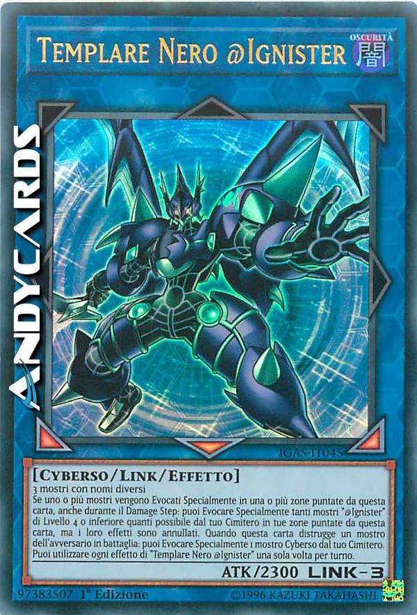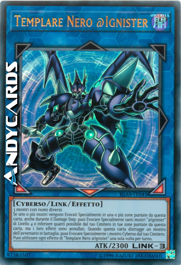 Se uno o più mostri vengono Evocati Specialmente in una o più zone puntate da questa carta, anche durante il Damage Step: puoi Evocare Specialmente tanti mostri "@Ignister" di Livello 4 o inferiore quanti possibile dal tuo Cimitero in tue zone puntate da questa carta, ma i loro effetti sono annullati. Quando questa carta distrugge un mostro dell'avversario in battaglia: puoi Evocare Specialmente 1 mostro Cyberso dal tuo Cimitero. Puoi utilizzare ogni effetto di "Templare Nero @Ignister" una sola volta per turno.