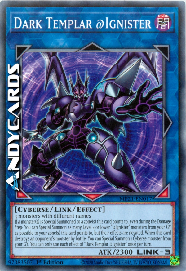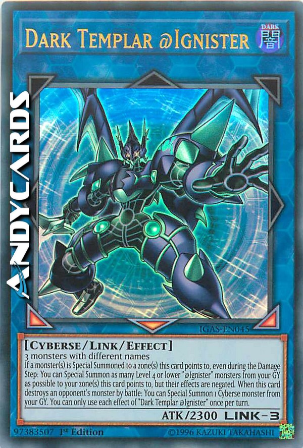 If a monster(s) is Special Summoned to a zone(s) this card points to, even during the Damage Step: You can Special Summon as many Level 4 or lower "@Ignister" monsters from your GY as possible to your zone(s) this card points to, but their effects are negated. When this card destroys an opponent's monster by battle: You can Special Summon 1 Cyberse monster from your GY. You can only use each effect of "Dark Templar @Ignister" once per turn.