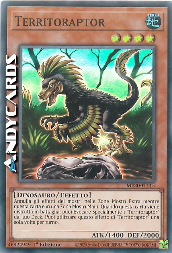 Annulla gli effetti dei mostri nelle Zone Mostri Extra mentre questa carta è in una Zona Mostri Main. Quando questa carta viene distrutta in battaglia: puoi Evocare Specialmente 1 "Territoraptor" dal tuo Deck. Puoi utilizzare questo effetto di "Territoraptor" una sola volta per turno.
