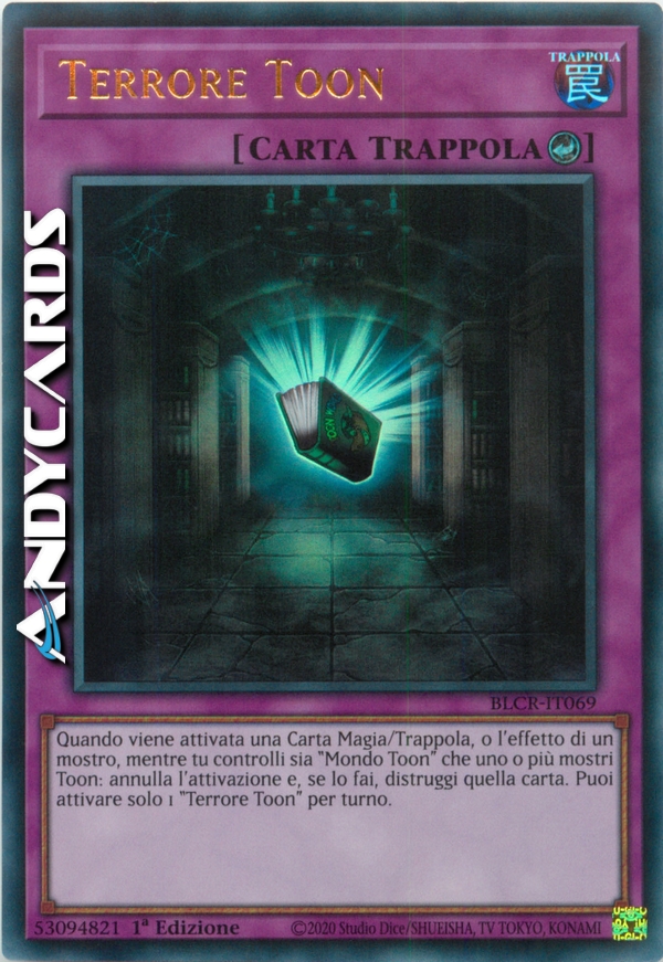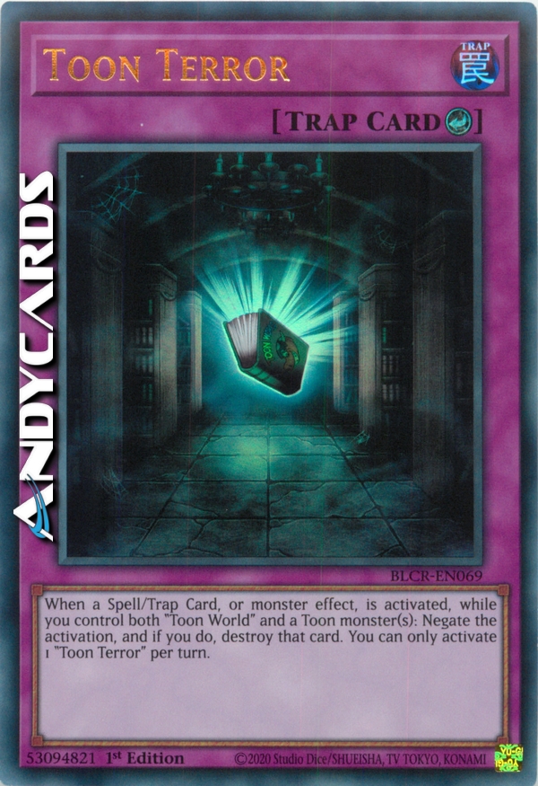 Quando viene attivata una Carta Magia/Trappola, o l'effetto di un mostro, mentre tu controlli sia "Mondo Toon" che uno o più mostri Toon: annulla l'attivazione e, se lo fai, distruggi quella carta. Puoi attivare solo 1 "Terrore Toon" per turno.