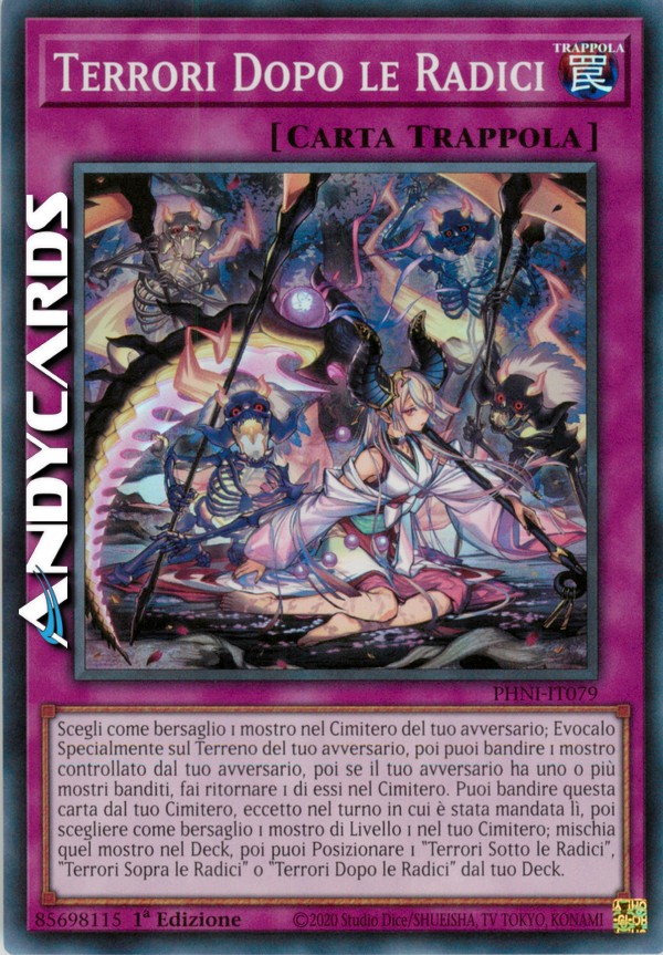 Scegli come bersaglio 1 mostro nel Cimitero del tuo avversario; Evocalo Specialmente sul Terreno del tuo avversario, poi puoi bandire 1 mostro controllato dal tuo avversario, poi se il tuo avversario ha uno o più mostri banditi, fai ritornare 1 di essi nel Cimitero. Puoi bandire questa carta dal tuo Cimitero, eccetto nel turno in cui è stata mandata lì, poi scegliere come bersaglio 1 mostro di Livello 1 nel tuo Cimitero; mischia quel mostro nel Deck, poi puoi Posizionare 1 "Terrori Sotto le Radici", "Terrori Sopra le Radici" o "Terrori Dopo le Radici" dal tuo Deck.