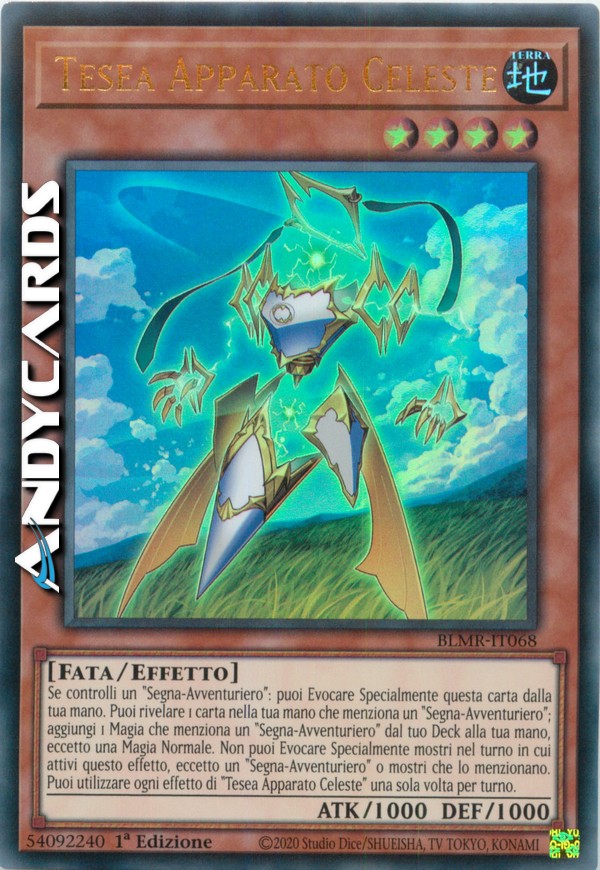 Se controlli un "Segna-Avventuriero": puoi Evocare Specialmente questa carta dalla tua mano. Puoi rivelare 1 carta nella tua mano che menziona un "Segna-Avventuriero"; aggiungi 1 Magia che menziona un "Segna-Avventuriero" dal tuo Deck alla tua mano, eccetto una Magia Normale. Non puoi Evocare Specialmente mostri nel turno in cui attivi questo effetto, eccetto un "Segna-Avventuriero" o mostri che lo menzionano. Puoi utilizzare ogni effetto di "Tesea Apparato Celeste" una sola volta per turno.