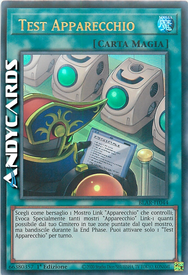 Scegli come bersaglio 1 Mostro Link "Apparecchio" che controlli; Evoca Specialmente tanti mostri "Apparecchio" Link-1 quanti possibile dal tuo Cimitero in tue zone puntate dal quel mostro, ma bandiscile durante la End Phase. Puoi attivare solo 1 "Test Apparecchio" per turno.