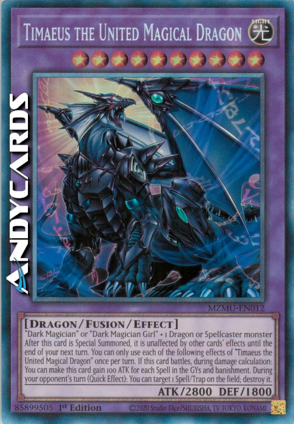 Dopo che questa carta è stata Evocata Specialmente, essa è immune agli effetti delle altre carte fino alla fine del tuo prossimo turno. Puoi utilizzare ognuno dei seguenti effetti di "Timaeus il Drago Magico Unito" una sola volta per turno. Se questa carta combatte, durante il calcolo dei danni: puoi far guadagnare a questa carta 100 ATK per ogni Magia nei Cimiteri e carte bandite. Durante il turno del tuo avversario (Effetto Rapido): puoi scegliere come bersaglio 1 Magia/Trappola sul Terreno; distruggila.