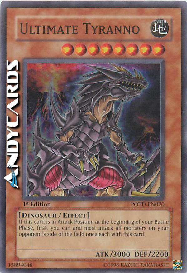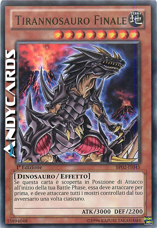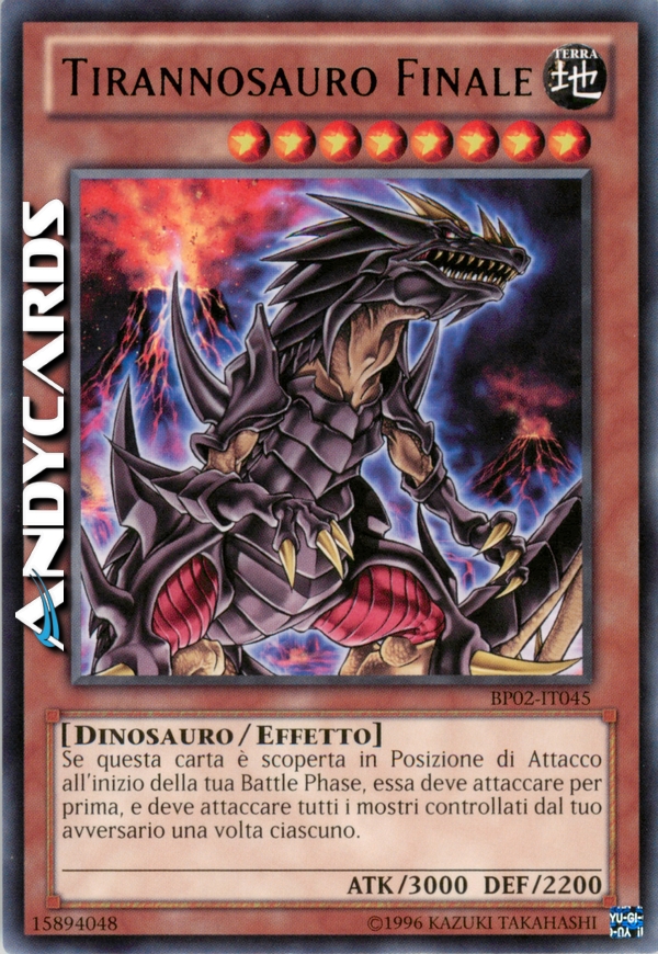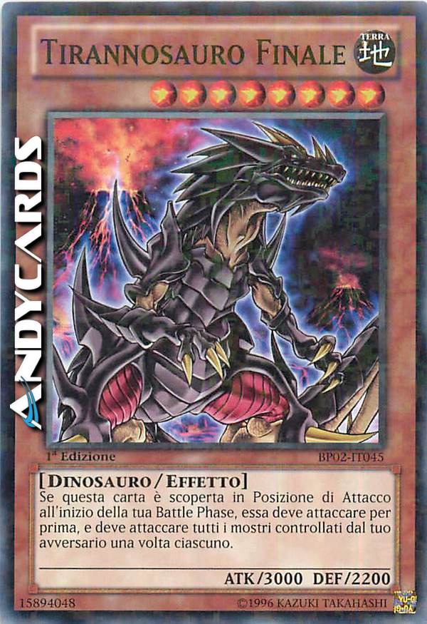 Questa carta può attaccare tutti i mostri controllati dal tuo avversario, una volta ciascuno. Durante la tua Battle Phase, se controlli un "Tirannosauro Finale" che può attaccare, i mostri diversi da "Tirannosauro Finale" non possono attaccare.