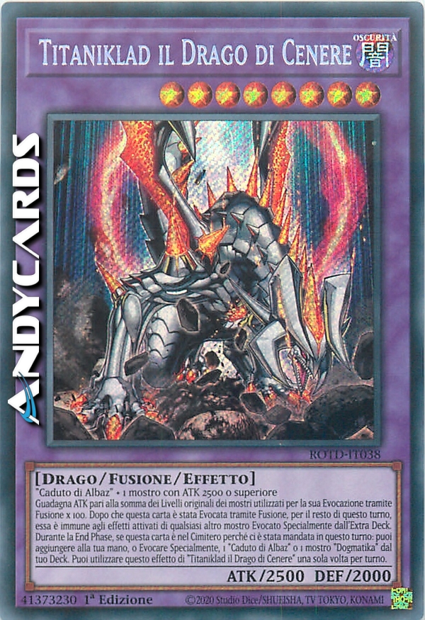Guadagna ATK pari alla somma dei Livelli originali dei mostri utilizzati per la sua Evocazione tramite Fusione x 100. Dopo che questa carta è stata Evocata tramite Fusione, per il resto di questo turno, essa è immune agli effetti attivati di qualsiasi altro mostro Evocato Specialmente dall'Extra Deck. Durante la End Phase, se questa carta è nel Cimitero perché ci è stata mandata in questo turno: puoi aggiungere alla tua mano, o Evocare Specialmente, 1 "Caduto di Albaz" o 1 mostro "Dogmatika" dal tuo Deck. Puoi utilizzare questo effetto di "Titaniklad il Drago di Cenere" una sola volta per turno.