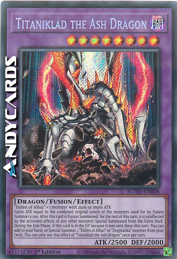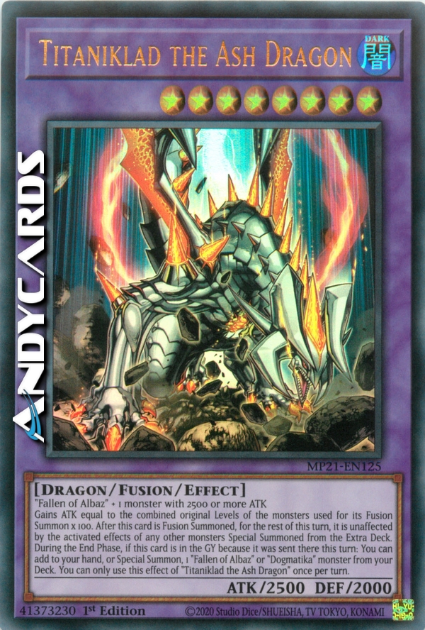 Gains ATK equal to the combined original Levels of the monsters used for its Fusion Summon x 100. After this card is Fusion Summoned, for the rest of this turn, it is unaffected by the activated effects of any other monsters Special Summoned from the Extra Deck. During the End Phase, if this card is in the GY because it was sent there this turn: You can add to your hand, or Special Summon, 1 "Dogmatika" monster or 1 "Fallen of Albaz" from your Deck. You can only use this effect of "Titaniklad the Ash Dragon" once per turn.