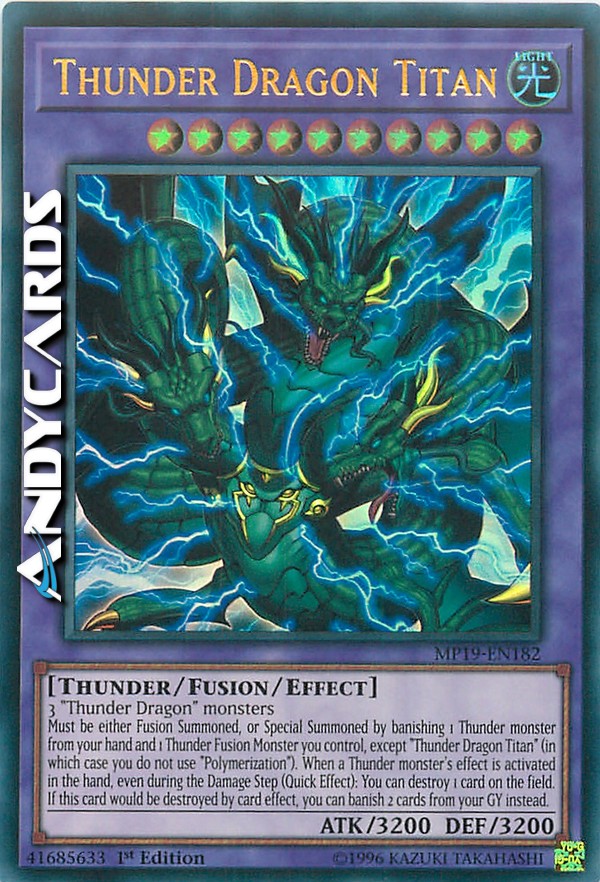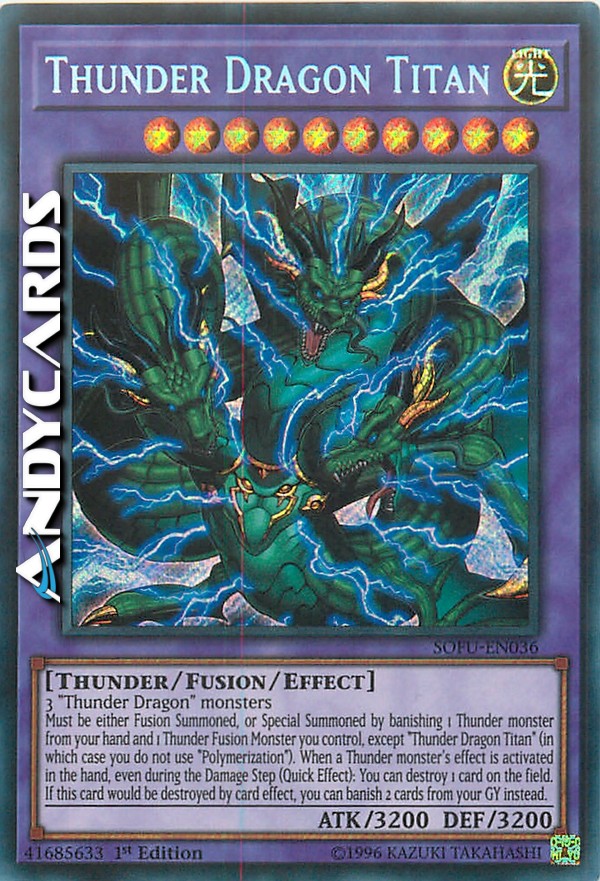 Must be either Fusion Summoned, or Special Summoned by banishing 1 Thunder monster from your hand and 1 Thunder Fusion Monster you control, except "Thunder Dragon Titan" (in which case you do not use "Polymerization"). When a Thunder monster's effect is activated in the hand, even during the Damage Step (Quick Effect): You can destroy 1 card on the field. If this card would be destroyed by card effect, you can banish 2 cards from your GY instead.