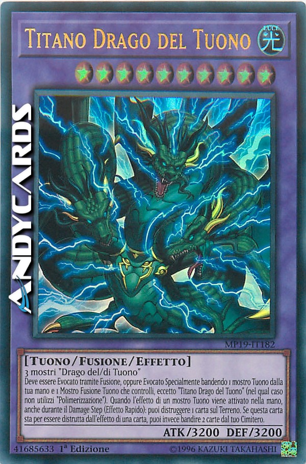 Deve essere Evocato tramite Fusione, oppure Evocato Specialmente bandendo 1 mostro Tuono dalla tua mano e 1 Mostro Fusione Tuono che controlli, eccetto "Titano Drago del Tuono" (nel qual caso non utilizzi "Polimerizzazione"). Quando l'effetto di un mostro Tuono viene attivato nella mano, anche durante il Damage Step (Effetto Rapido): puoi distruggere 1 carta sul Terreno. Se questa carta sta per essere distrutta dall'effetto di una carta, puoi invece bandire 2 carte dal tuo Cimitero.