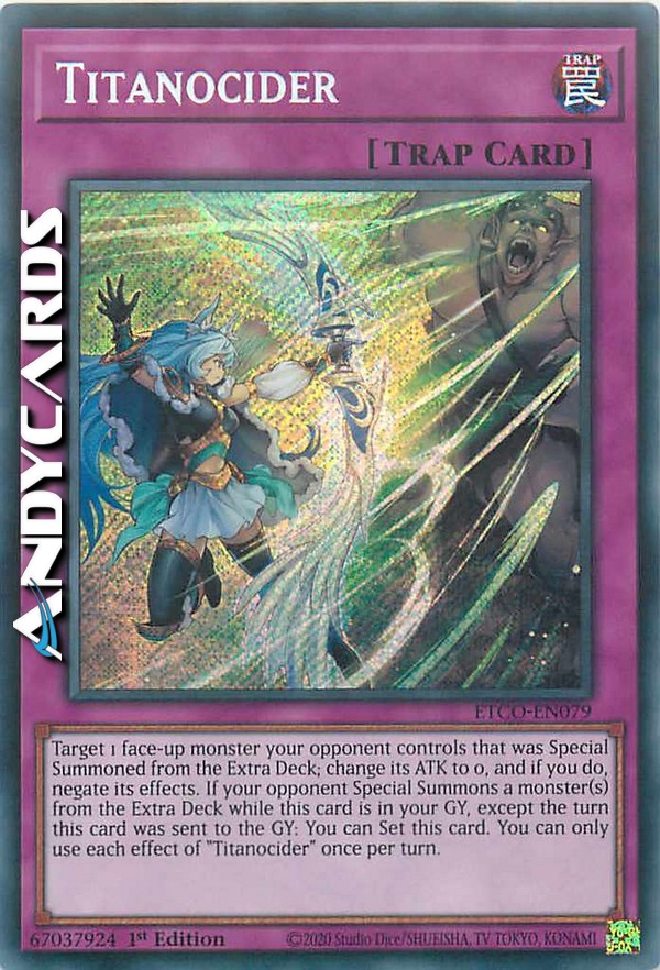 Scegli come bersaglio 1 mostro scoperto controllato dal tuo avversario che è stato Evocato Specialmente dall'Extra Deck; cambia il suo ATK a 0 e, se lo fai, annulla i suoi effetti. Se il tuo avversario Evoca Specialmente uno o più mostri dall'Extra Deck mentre questa carta è nel tuo Cimitero, eccetto nel turno in cui questa carta è stata mandata al Cimitero: puoi Posizionare questa carta. Puoi utilizzare ogni effetto di "Titanocidio" una sola volta per turno.