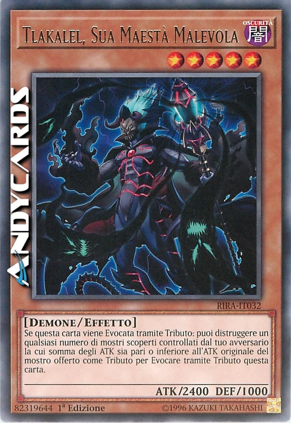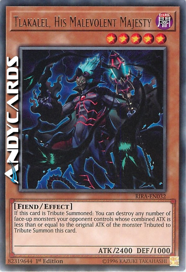 Se questa carta viene Evocata tramite Tributo: puoi distruggere un qualsiasi numero di mostri scoperti controllati dal tuo avversario la cui somma degli ATK sia pari o inferiore all'ATK originale del mostro offerto come Tributo per Evocare tramite Tributo questa carta.