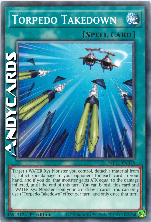 Target 1 WATER Xyz Monster you control; detach 1 material from it, inflict 400 damage to your opponent for each card in your hand, and if you do, that monster gains ATK equal to the damage inflicted, until the end of this turn. You can banish this card and 1 WATER Xyz Monster from your GY; draw 2 cards. You can only use 1 "Torpedo Takedown" effect per turn, and only once that turn.