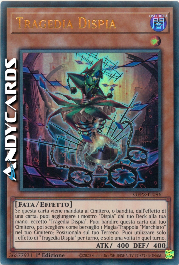 Se questa carta viene mandata al Cimitero, o bandita, dall'effetto di una carta: puoi aggiungere 1 mostro "Dispia" dal tuo Deck alla tua mano, eccetto "Tragedia Dispia". Puoi bandire questa carta dal tuo Cimitero, poi scegliere come bersaglio 1 Magia/Trappola "Marchiato" nel tuo Cimitero; Posizionala sul tuo Terreno. Puoi utilizzare solo 1 effetto di "Tragedia Dispia" per turno, e solo una volta in quel turno.