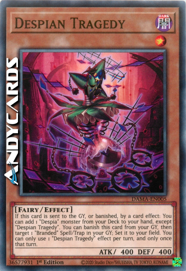 If this card is sent to the GY, or banished, by card effect: You can add 1 "Despia" monster from your Deck to your hand, except "Despian Tragedy". You can banish this card from your GY, then target 1 "Branded" Spell/Trap in your GY; Set it to your field. You can only use 1 "Despian Tragedy" effect per turn, and only once that turn.