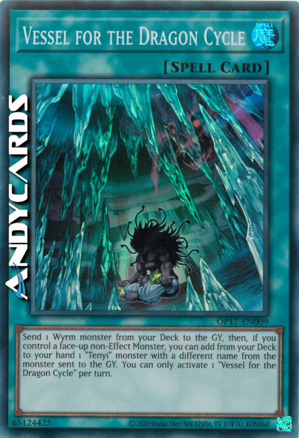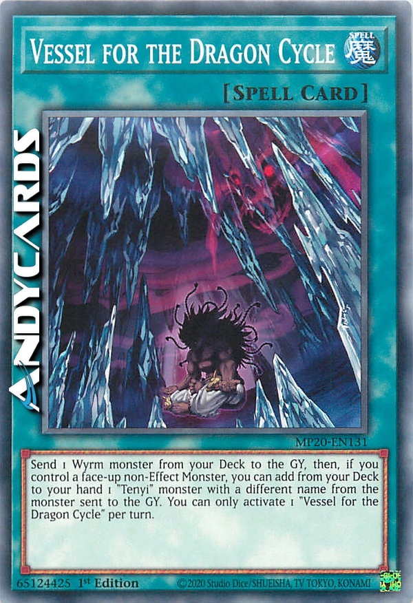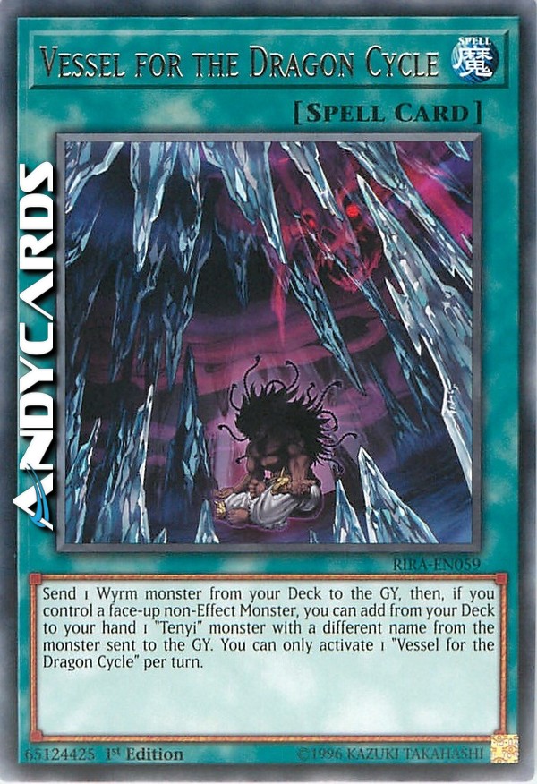 Send 1 Wyrm monster from your Deck to the GY, then, if you control a face-up non-Effect Monster, you can add from your Deck to your hand 1 "Tenyi" monster with a different name from the monster sent to the GY. You can only activate 1 "Vessel for the Dragon Cycle" per turn.