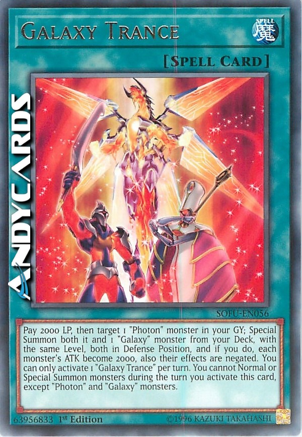 Pay 2000 LP, then target 1 "Photon" monster in your GY; Special Summon both it and 1 "Galaxy" monster from your Deck, with the same Level, both in Defense Position, and if you do, each monster's ATK become 2000, also their effects are negated. You can only activate 1 "Galaxy Trance" per turn. You cannot Normal or Special Summon monsters during the turn you activate this card, except "Photon" and "Galaxy" monsters.