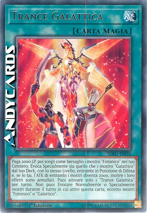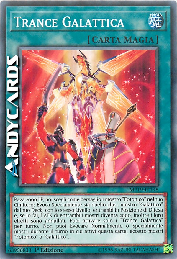 Paga 2000 LP, poi scegli come bersaglio 1 mostro "Fotonico" nel tuo Cimitero; Evoca Specialmente sia quello che 1 mostro "Galattico" dal tuo Deck, con lo stesso Livello, entrambi in Posizione di Difesa e, se lo fai, l'ATK di entrambi i mostri diventa 2000, inoltre i loro effetti sono annullati. Puoi attivare solo 1 "Trance Galattica" per turno. Non puoi Evocare Normalmente o Specialmente mostri durante il turno in cui attivi questa carta, eccetto mostri "Fotonico" o "Galattico".