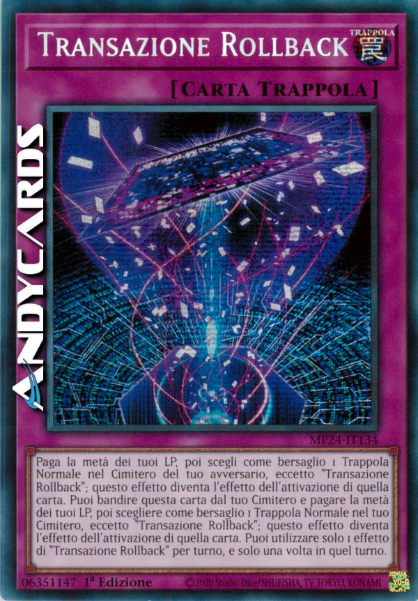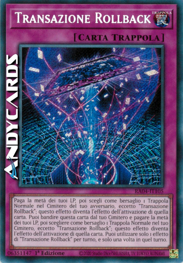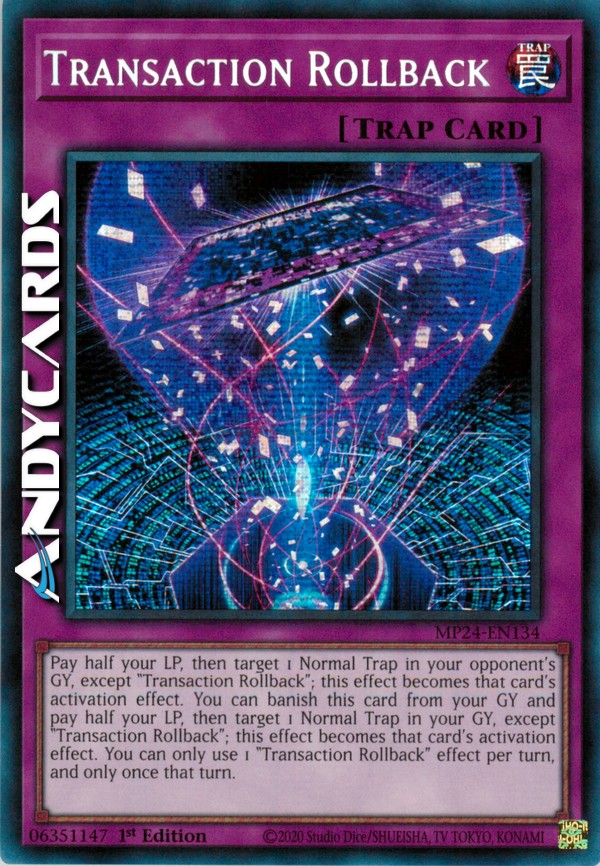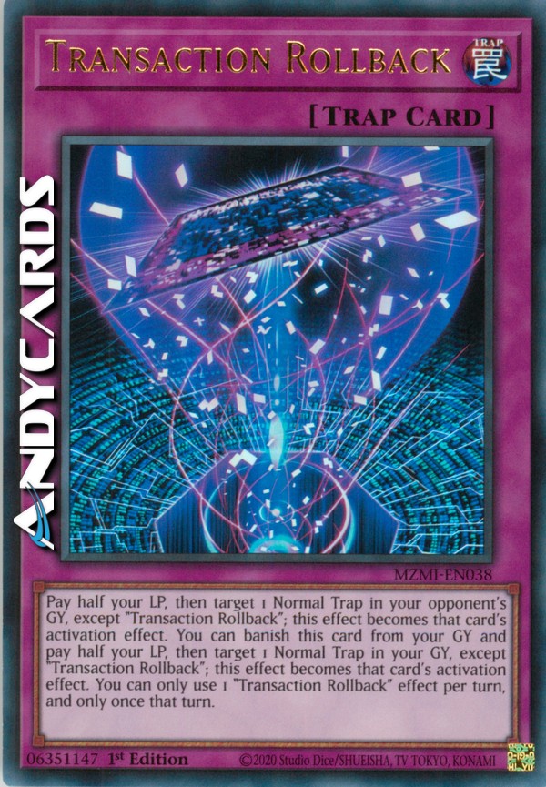 Pay half your LP, then target 1 Normal Trap in your opponent's GY, except "Transaction Rollback"; this effect becomes that card's activation effect. You can banish this card from your GY and pay half your LP, then target 1 Normal Trap in your GY, except "Transaction Rollback"; this effect becomes that card's activation effect. You can only use 1 "Transaction Rollback" effect per turn, and only once that turn.