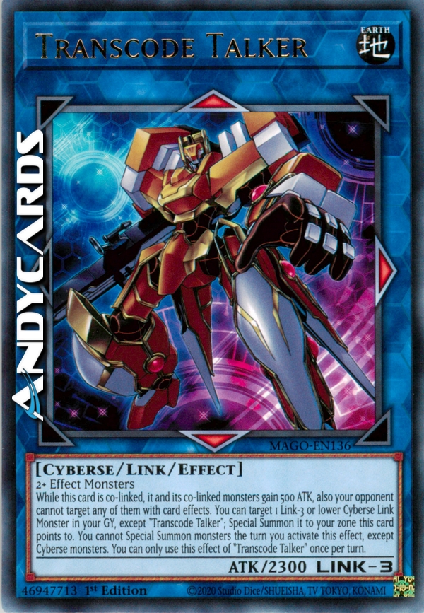 While this card is co-linked, it and its co-linked monsters gain 500 ATK, also your opponent cannot target any of them with card effects. You can target 1 Link-3 or lower Cyberse Link Monster in your GY, except "Transcode Talker"; Special Summon it to your zone this card points to. You cannot Special Summon monsters the turn you activate this effect, except Cyberse monsters. You can only use this effect of "Transcode Talker" once per turn.