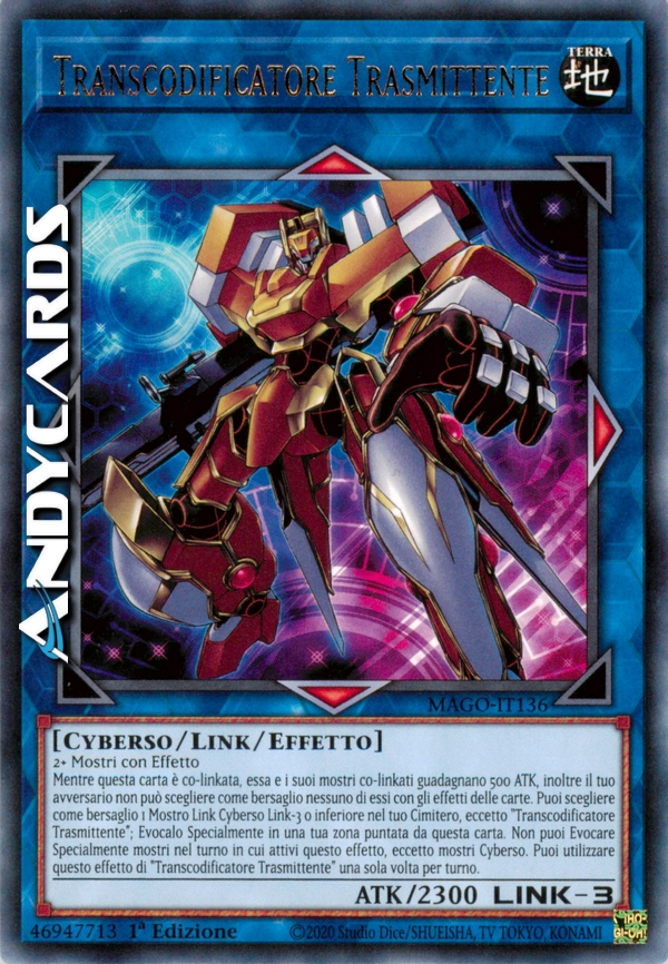 Mentre questa carta è co-linkata, essa e i suoi mostri co-linkati guadagnano 500 ATK, inoltre il tuo avversario non può scegliere come bersaglio nessuno di essi con gli effetti delle carte. Puoi scegliere come bersaglio 1 Mostro Link Cyberso Link 3 o inferiore nel tuo Cimitero, eccetto "Transcodificatore Trasmittente"; Evocalo Specialmente in una tua zona puntata da questa carta. Non puoi Evocare Specialmente mostri nel turno in cui attivi questo effetto, eccetto mostri Cyberso. Puoi utilizzare questo effetto di "Transcodificatore Trasmittente" una sola volta per turno.